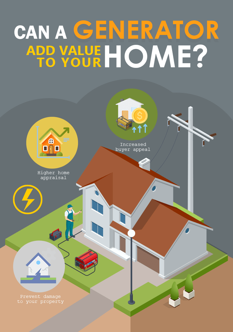 A generator can increase the value of your home anywhere up to 5 percent. And even if your home's appraised value doesn’t go up, it’s an upgrade that you can invest in for your usage and convenience.